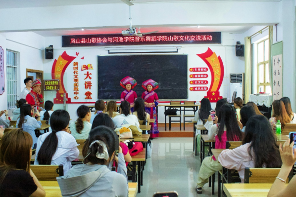 在柳州三江侗寨,师生们走进侗族鼓楼、风雨桥,观摩侗族大歌、芦笙舞、“坐妹”演出等传统艺术表演,沉浸式体验侗族人文风情;在桂林漓江畔感受“山水甲天下”的自然奇观,从喀斯特地貌的灵动线条中汲取创作灵感;在河池市凤山县,重点调研了凤山县非物质文化遗产类的舞蹈及山歌调式。在当地文化馆专家指导下,学生们系统学习了瑶族的竹绑舞等传统舞蹈的肢体语言与文化内涵,并参与山歌对唱实践,记录古老调式的旋律特点;在巴马,“梦·巴马”的演出以天地为幕、山水为景的恢宏演绎,生动呈现了瑶族祝著节、铜鼓舞等非遗文化,让学生直观感受到民族艺术与现代舞台技术的创新融合。