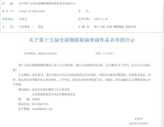 近日,文化和旅游部艺术司正式公示第十五届全国舞蹈展演参演...